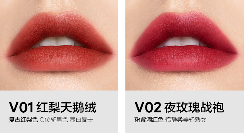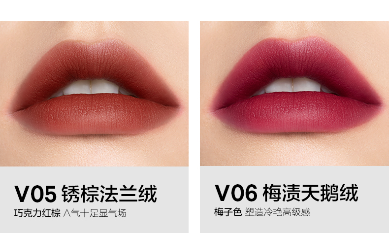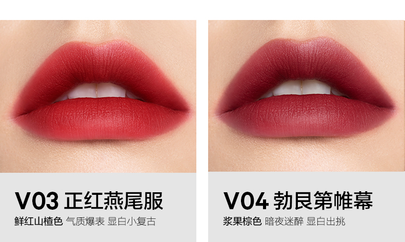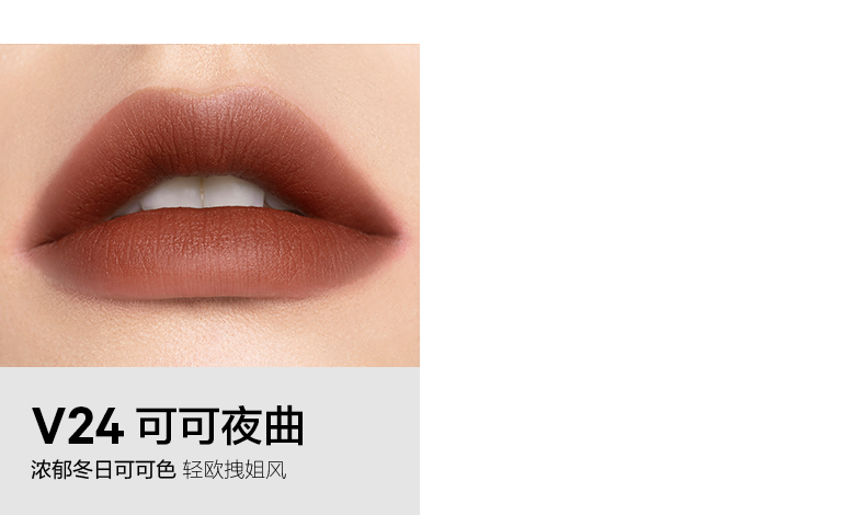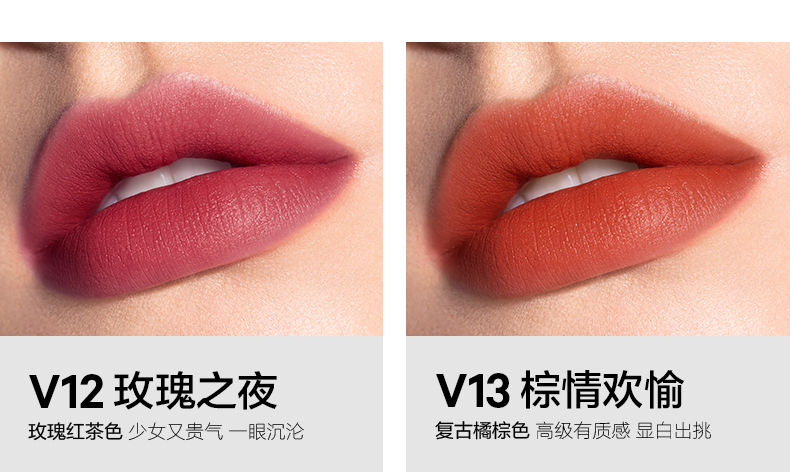 V13棕情欢愉 复古橘棕色 V14绯色耳语 豆沙红棕色 V16暗生情愫 巧克力色 V24可可夜曲 可可色 V25蔷薇红茶 陶土色 |