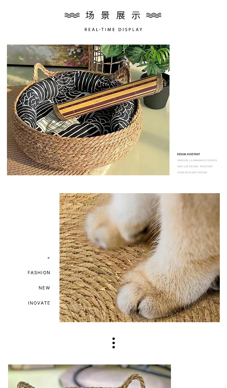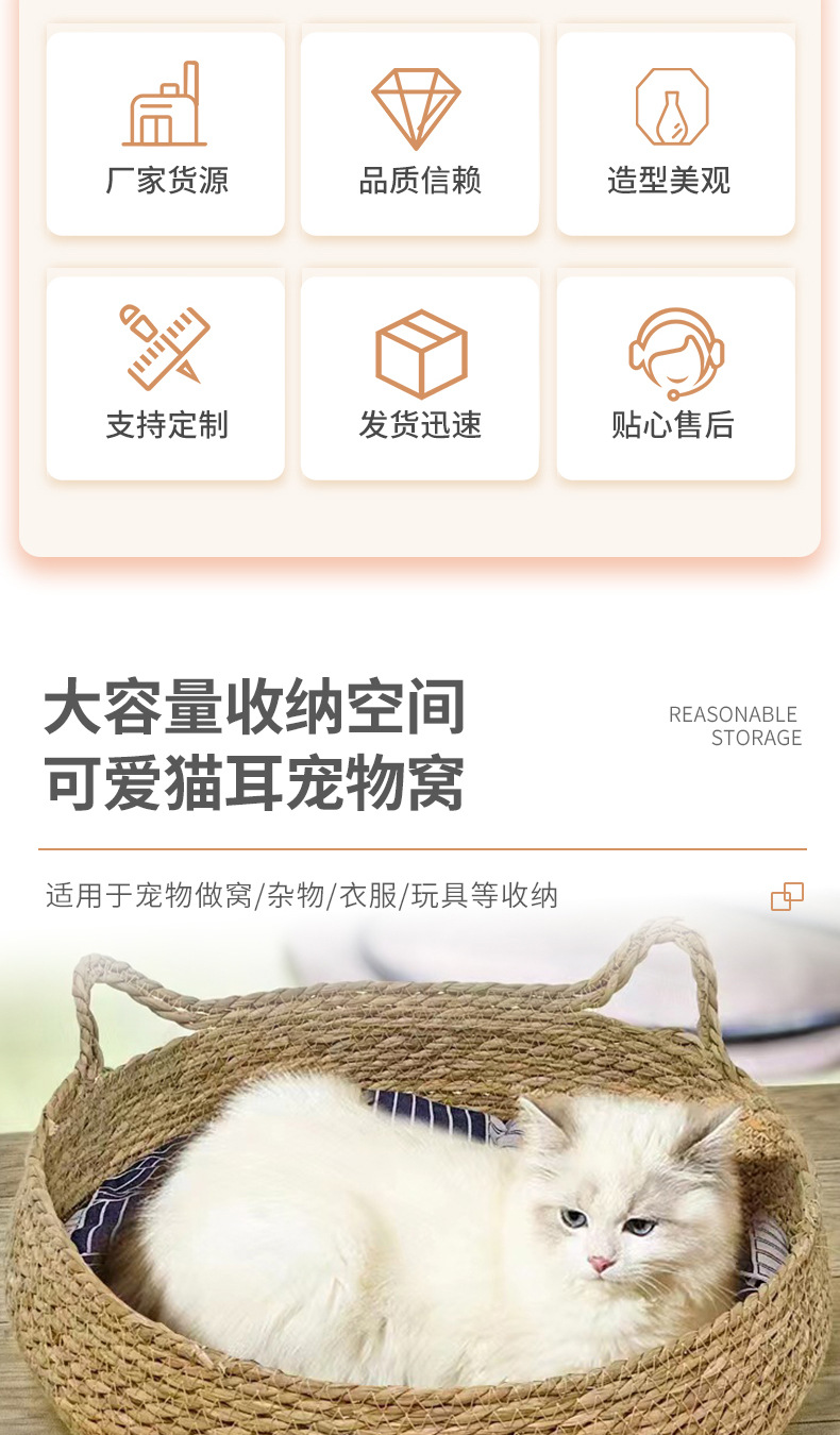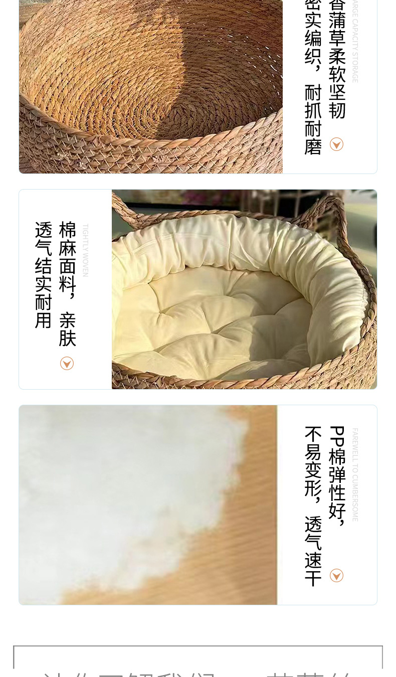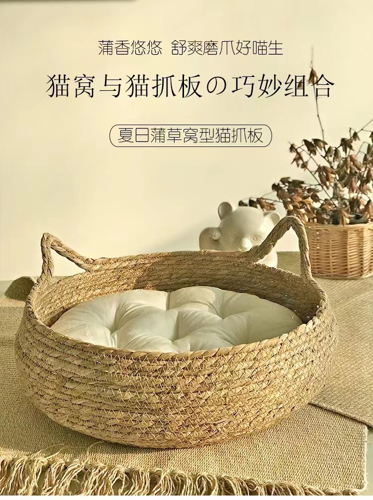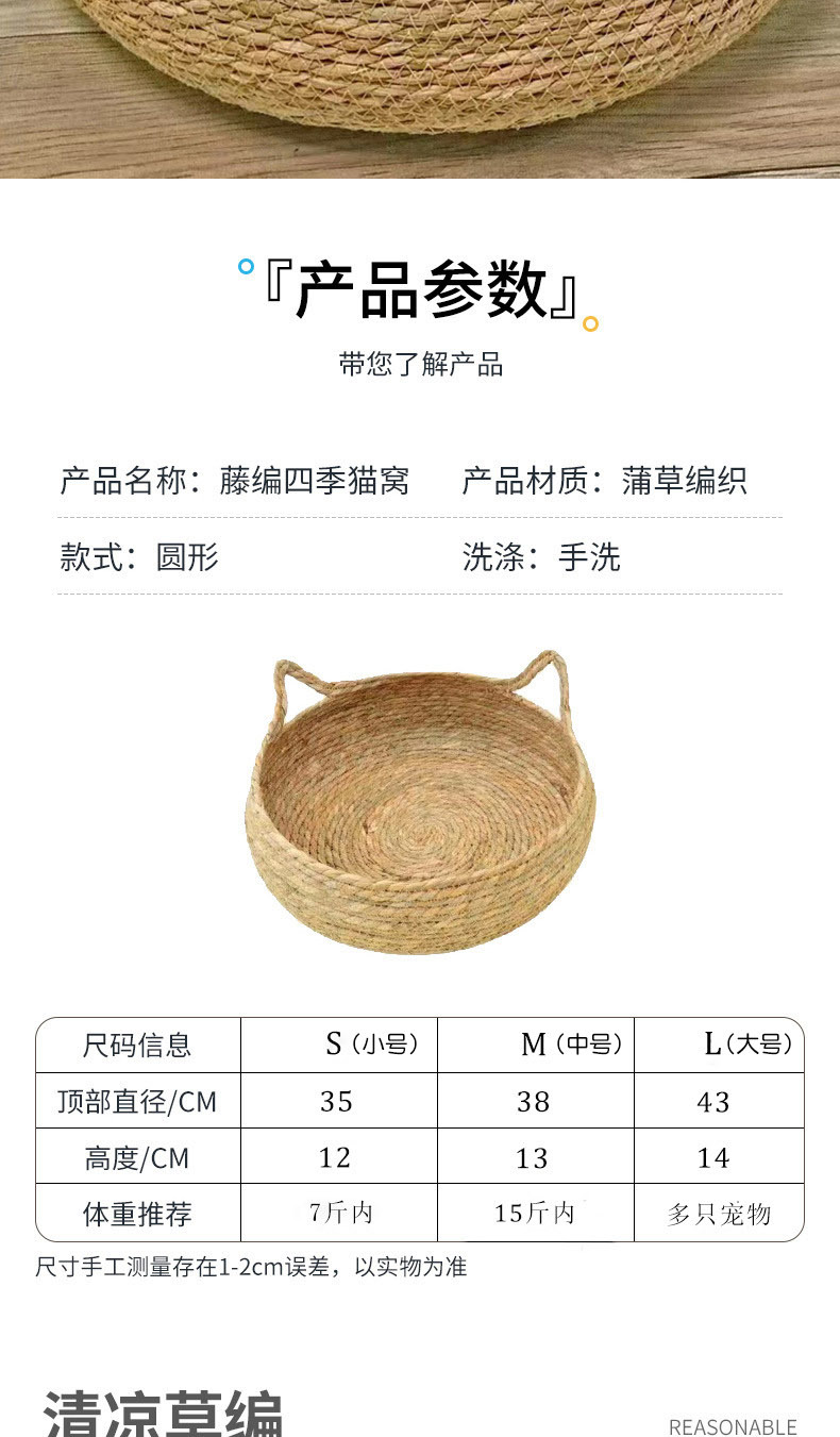 灵宠物语 四季通用草编猫窝狗窝 海青色窝球一体+深蓝PP垫+抱枕L码大型17斤内